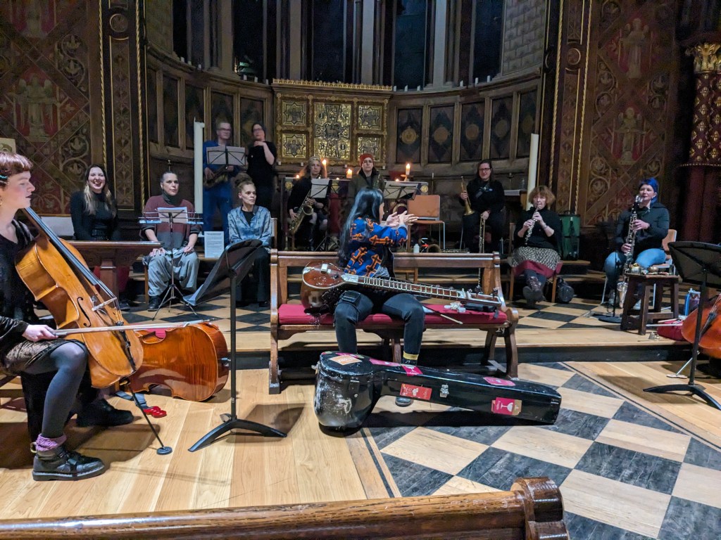 Paula Riofrio, Lu Greco (dances); Anne Yin, Julia Brüssells (violins), Sofia Vaisman Maturana, Khabat Abas, Kirke Gross (cellos); Damsel Elysium (violin, double bass), Shama Rahman (sitar); Lisa Elde, Sharon Gal (voices); Rosa Theodora (Korg!), Olga Ksendzovska (piano), Shima Kobayashi (chromatic harmonica), Barbara Mukoda (flutes), Charlotte Keeffe (trumpet), Dee Byrne, Caroline Kraabel (alto saxes), Sue Lynch (tenor sax), Cath Roberts (baritone sax), Maureen Wolloshin (oboe)… plus Julie Pickard making her beautiful improvised observational drawings of improvised music – 22 people!