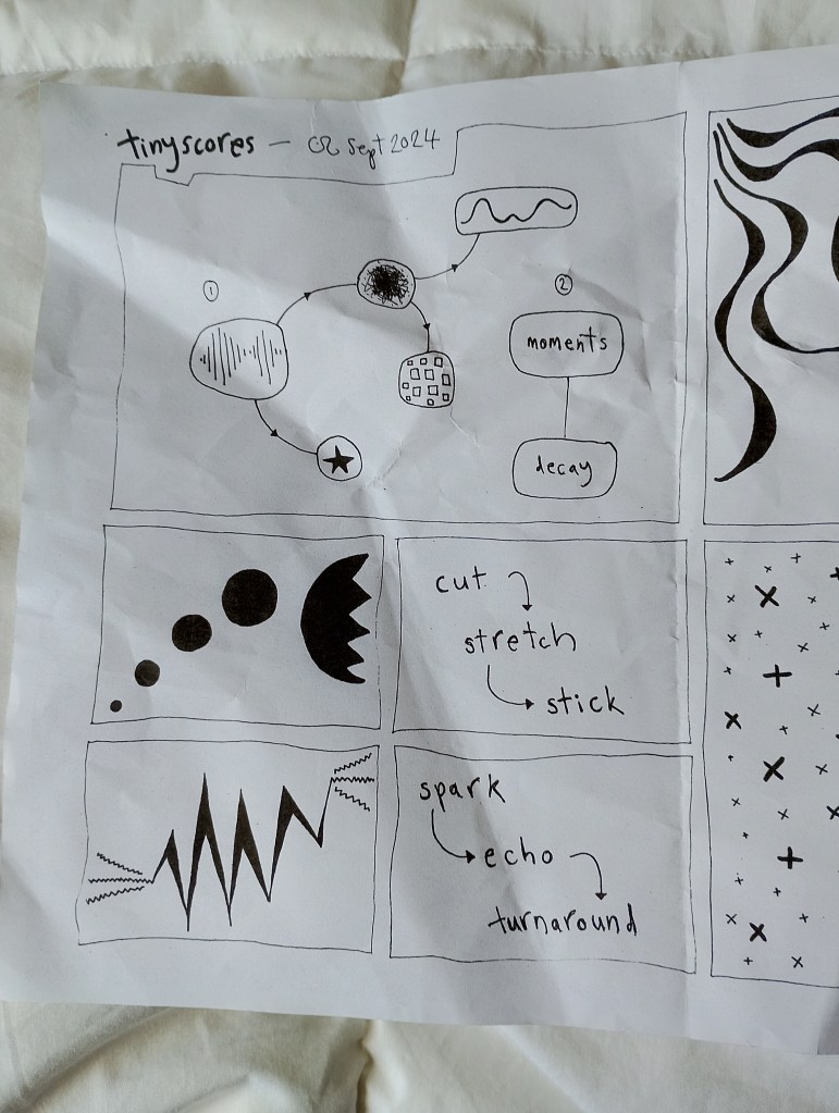 And, finally, we played some of Cath Roberts’ small graphic scores; they offered an excellent explanation, about the utter ambiguity of these graphic pieces – they’re not meant to be prescriptive or restrictive, but just stimulating in whatever way works… and the results were really interesting – it still felt very free, but also… playful, surprising, making us curious… things happened that probably wouldn’t have in a completely free improvisation, but we didn’t feel we were being CONTROLLED!