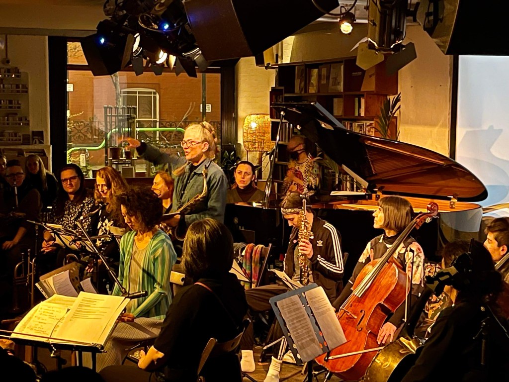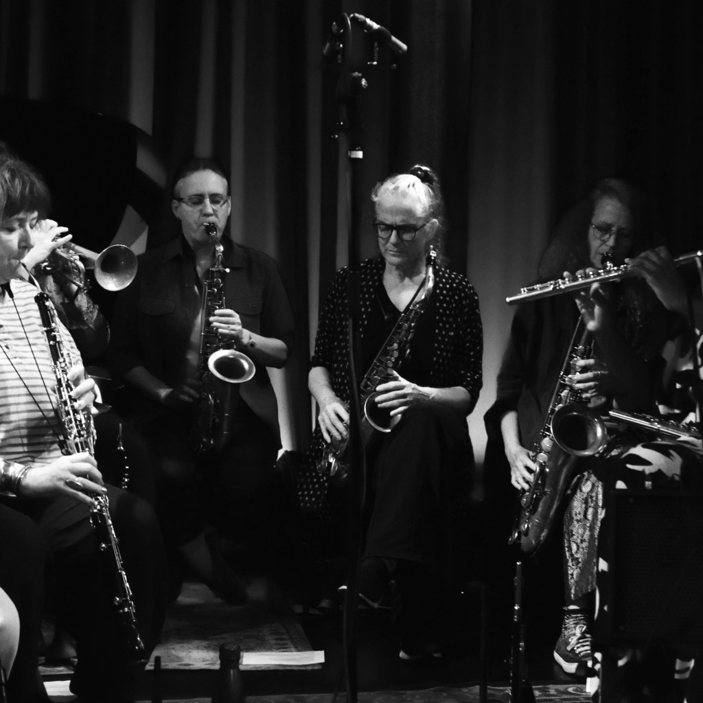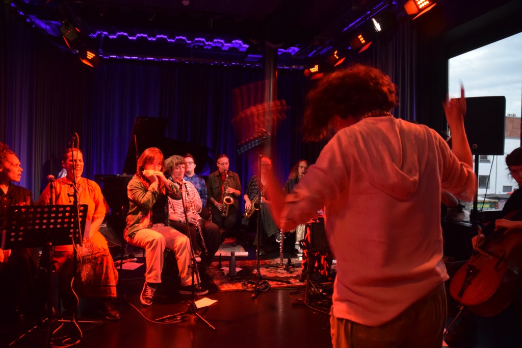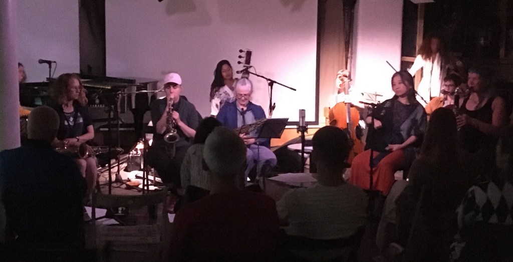 Lisa Elde, Sharon Gal (voices); Shima Kobayashi (chromatic harmonica), Maureen Wolloshin (oboe), Charlotte Keeffe (trumpet); Dee Byrne, Caroline Kraabel (alto saxes); Sue Lynch (tenor sax), Barbie Mukoda (flutes), Damsel Elysium (double bass), Shama Rahman (sitar); Olga Ksendzovska conducting (also piano). The Vortex, Dalston, 10 July 2024. Photo by Tom Ward.