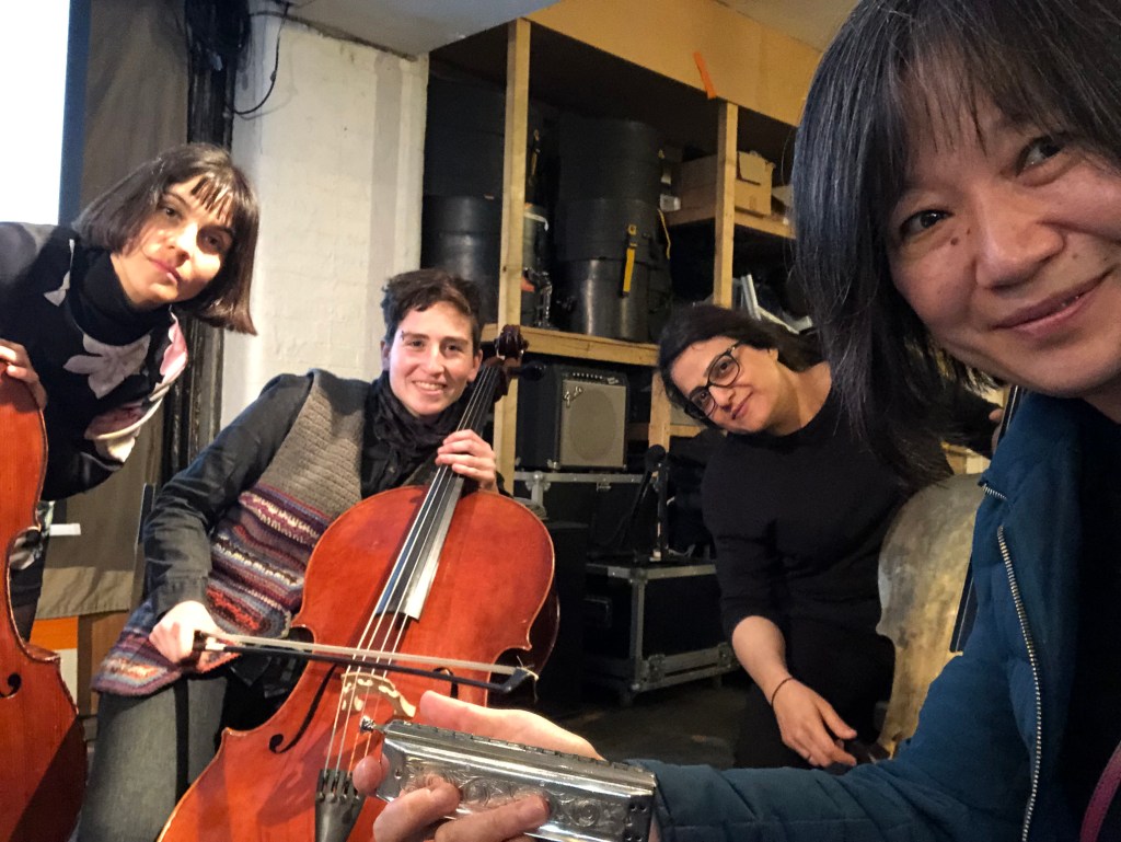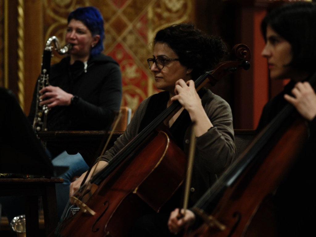 Emily Shapiro, bass clarinet; Khabat Abas and Isidora Edwards, cellos. ONe_Orchestra New, chapel of Kings College London, 8 March 2024. Photo by Tom Burman.